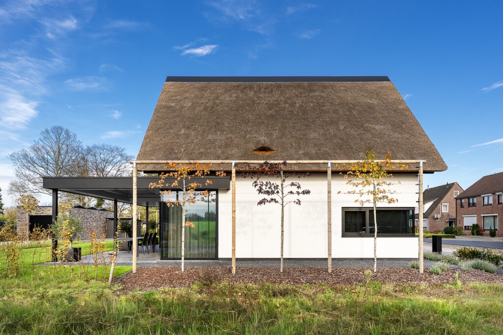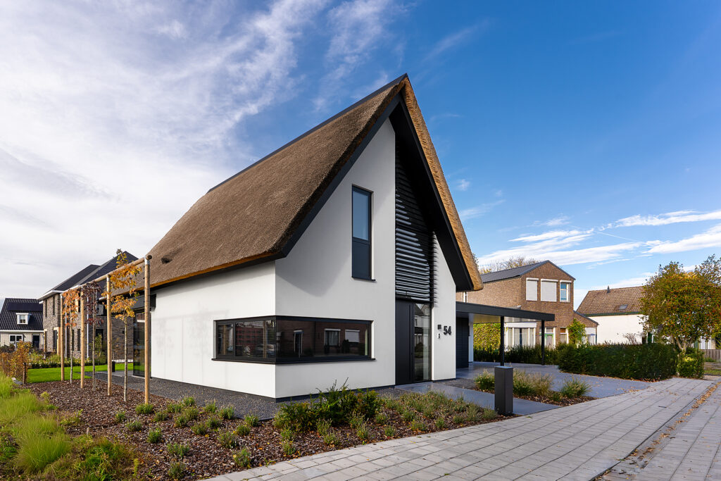 De architectuur kenmerkt zich door een eigentijdse, ingetogen esthetiek: een traditioneel rieten dak wordt gecombineerd met strak wit gevelstucwerk en donkere, contrasterende kozijnen. Grote raampartijen aan de achterzijde maximaliseren de natuurlijke lichtinval en het tuincontact, terwijl een strategisch geplaatst hoekkozijn privacy waarborgt zonder in te boeten aan ruimtelijk inzicht.