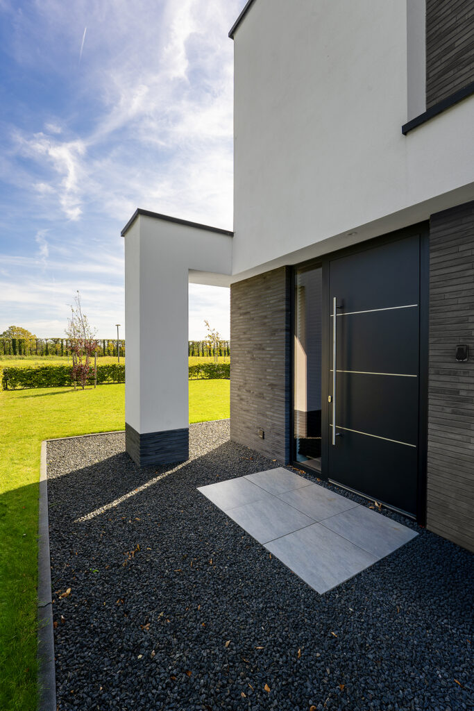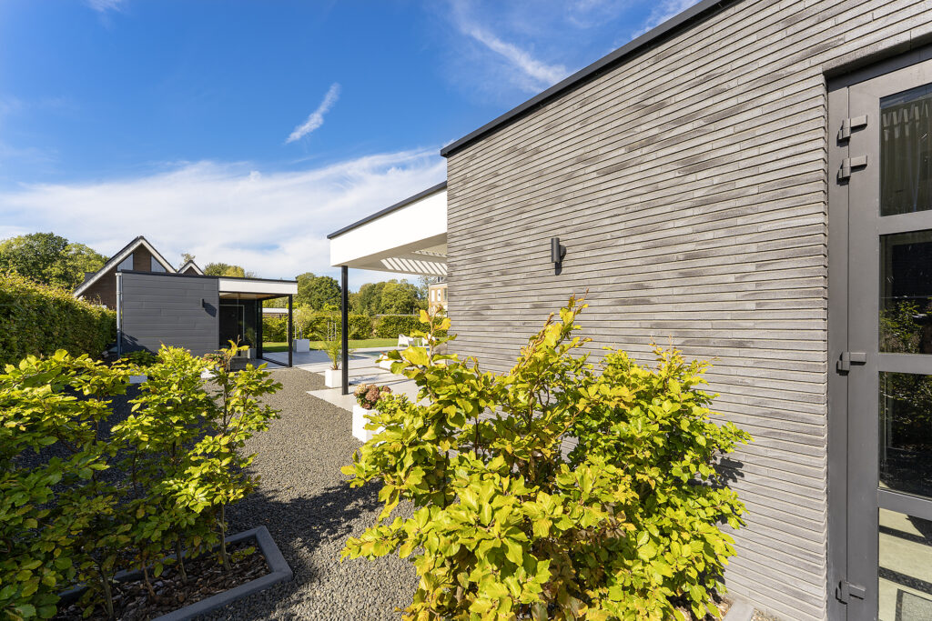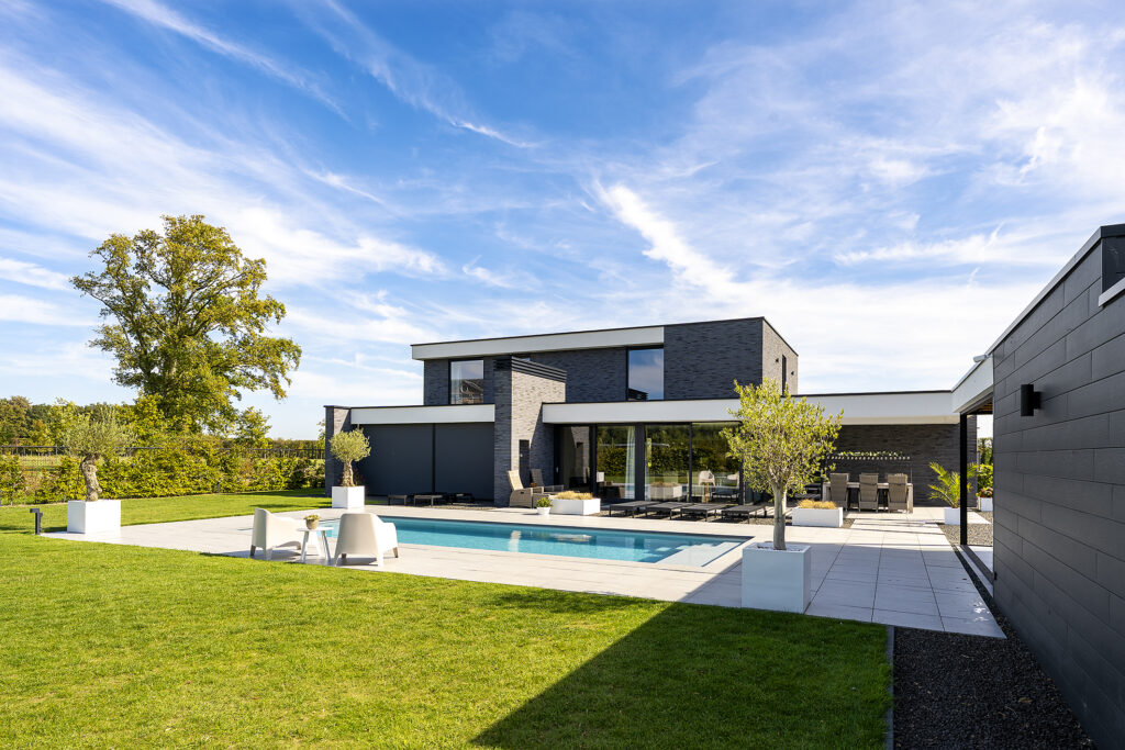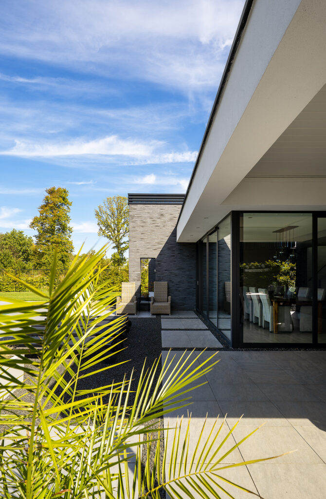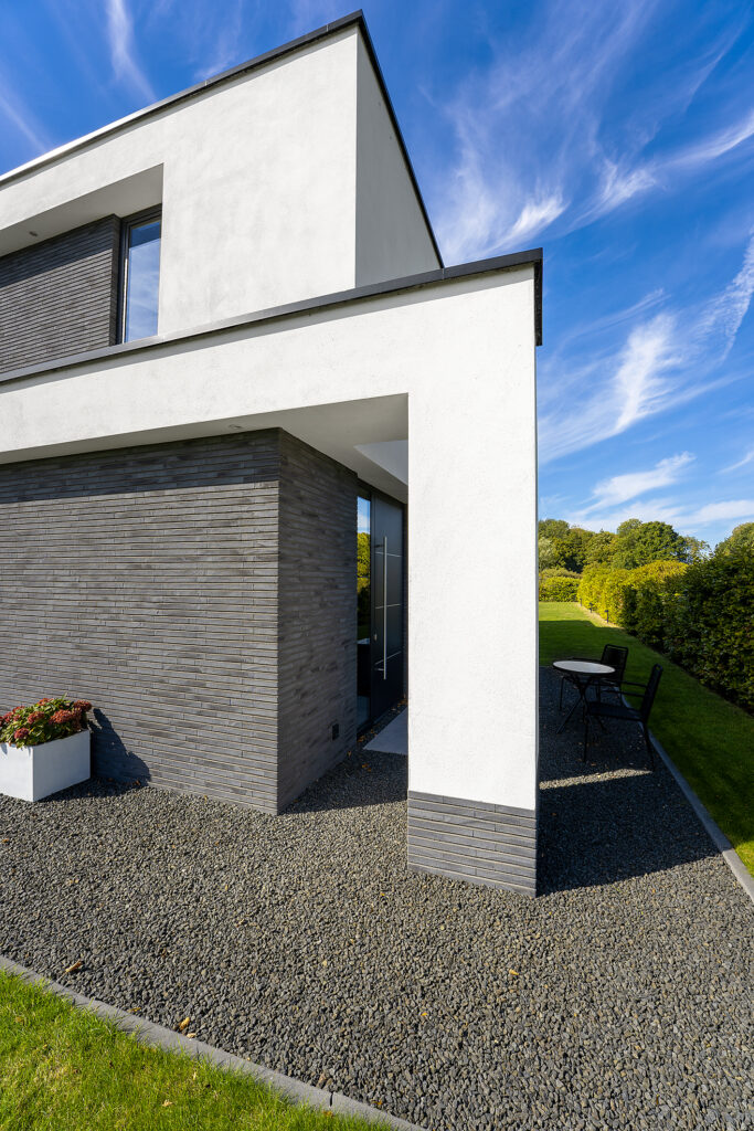 De architectuur kenmerkt zich door een bewuste verticale en horizontale geleding. Ik heb gewerkt met een verschil in materiaalkeuzes — zoals de afwisseling van minerale steenstrips en gevelstucwerk — om deze geleding te versterken. Kleine aspecten, zoals de doorkijkjes, de specifieke steenstrips en een knusse overkapping aangrenzend aan het zwembad, maken de woning speels en uniek.