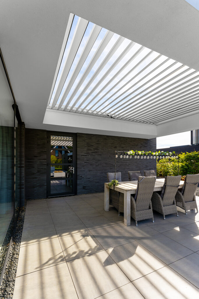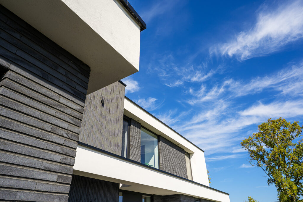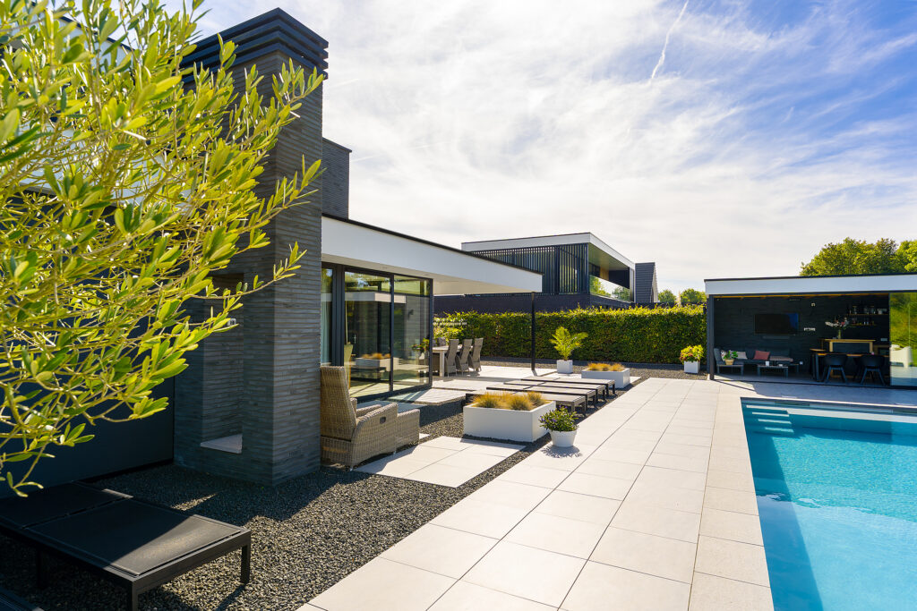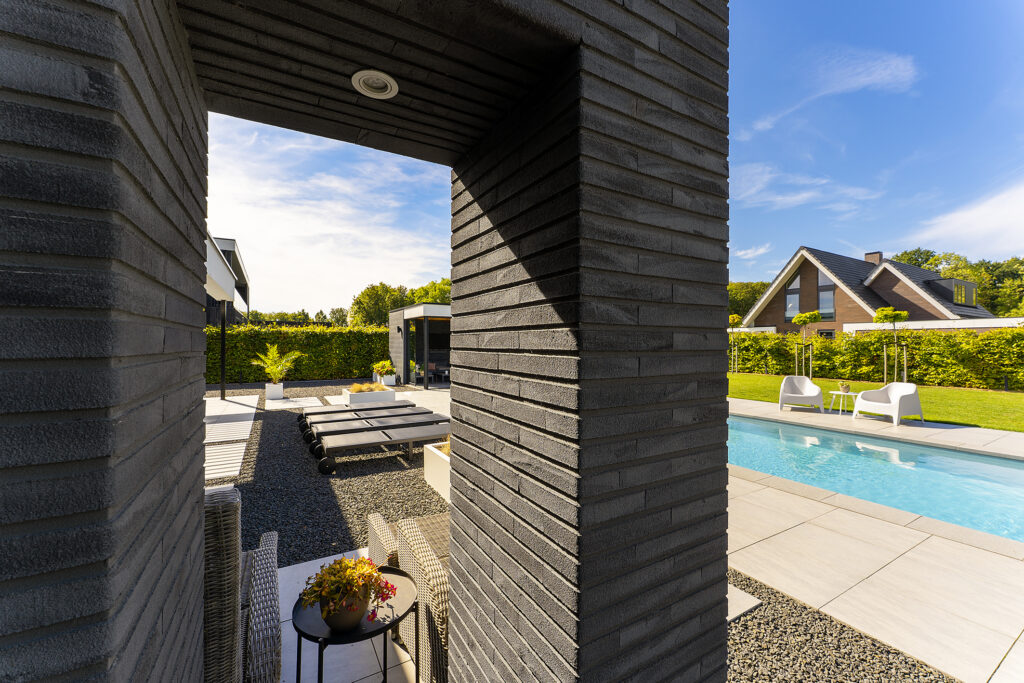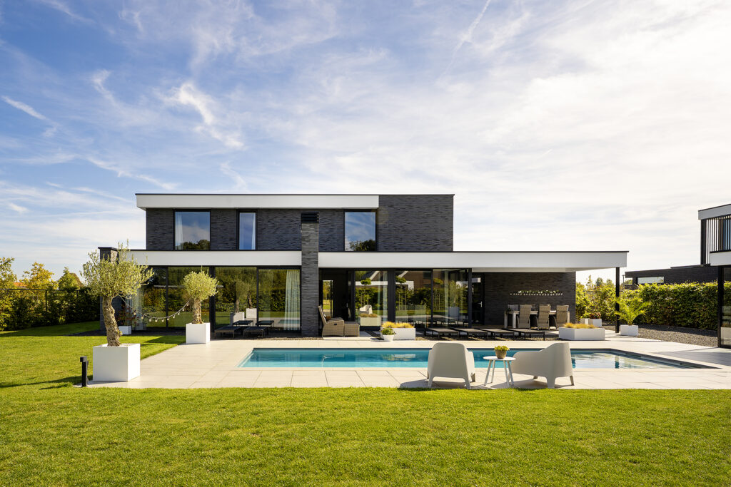 De architectuur kenmerkt zich door een bewuste verticale en horizontale geleding. Ik heb gewerkt met een verschil in materiaalkeuzes — zoals de afwisseling van minerale steenstrips en gevelstucwerk — om deze geleding te versterken. Kleine aspecten, zoals de doorkijkjes, de specifieke steenstrips en een knusse overkapping aangrenzend aan het zwembad, maken de woning speels en uniek.