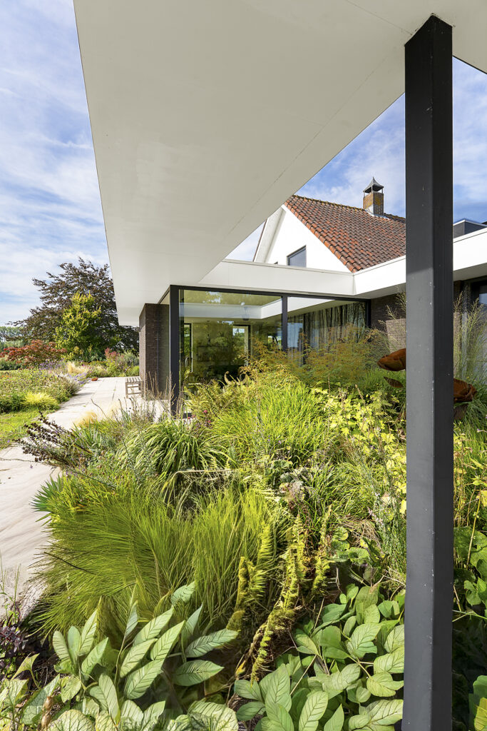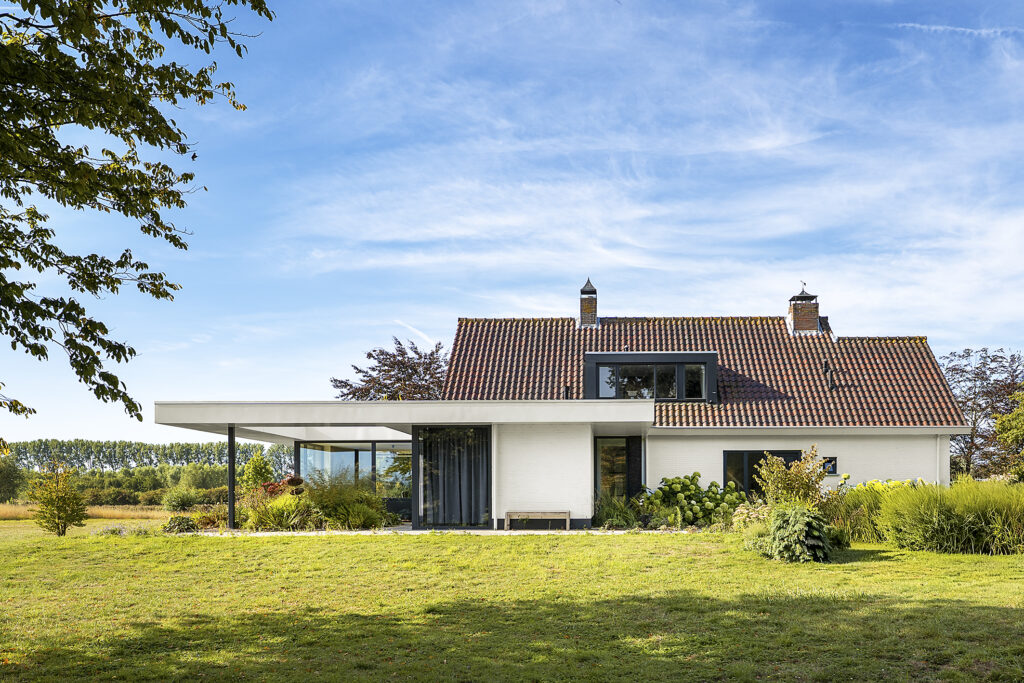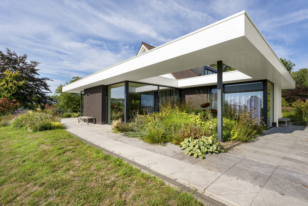 Een grote luifel omringt als het ware de bestaande en nieuwe bebouwing en smeedt het geheel tot één architectonische eenheid. In deze luifel heb ik een strategische sparing aangebracht aan de oostzijde, bij de slaapkamer, waardoor het ochtendlicht op een prachtige manier de ruimte binnenvalt.